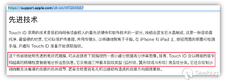 首先看下Apple的情況。網上關于IPhone 6系列手機的指紋模塊安全性資料顯示,touch ID很可能采用了更加先進的活體識別方式(有大量關于射頻真皮識別的新聞)。查閱相關專利,確實發現蘋果在這方面有所研究,例如蘋果公司的US 8180120 B2專利,使用固定角度的偏振光對手指進行照射,根據獲取到的手指中的氧合血紅蛋白和脫氧血紅蛋白、β-胡蘿卜素等等光譜情況來判斷真假手指。但是這種技術是否在TouchID中有使用呢?答案當然是沒有,否則我們的假指紋攻擊也不會通過。查閱了蘋果官網對TouchID的安全性介紹,我們可以發現,Touch ID仍然還是傳統單一的電容檢測技術,只是蘋果強調了它的精度是很高的。