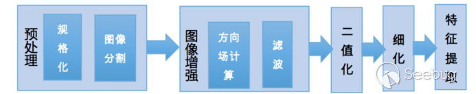 整體的特征提取需要如下步驟:圖像預處理、指紋圖像增強、二值化、細化、提取特征點等。其中指紋圖像增強方面最為重要,眾多學者做了大量研究工作。