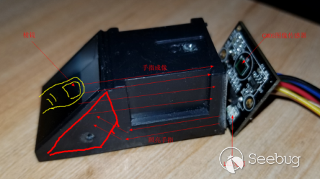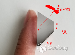 而當光源在全反射角以下時,光線從正下方射入,這時候光線不會從棱鏡上透射出去,但是手指與棱鏡接觸的區域,光線會發生所有角度的散射,這時候就會出現凸出的脊線部分為亮(看起來就像是接觸到玻璃的脊線把光都導走了并且亮了),谷線為暗(沒有接觸的部分CMOS看到的是黑色底板反射的黑像),這樣就可以形成指紋圖像,例如我手中的光學指紋模塊就是這種,工作時成像如圖3所示。當沒有手指放入的時候,由于CMOS只看到了反射的黑底板,會呈現全黑的圖像,光路圖如圖4所示。