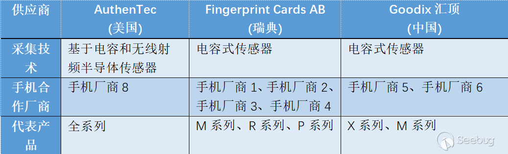 我們對常見的手機指紋識別方案進行了調研,發現市面上主要有: