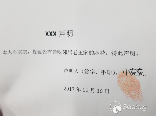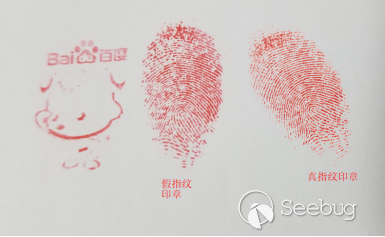 我們以圖21中的指紋圖像作為樣本,嘗試制作指紋印章。具體的細節出于安全目的本文就不詳述了。我們可以看到,使用這種方法生成的指紋印章如果再沾上些印泥,印出來的指紋圖像可以和實際用手指印生成的指紋圖像相比十分相似,甚至很難做區分,存在很高的合同欺詐等風險。如圖28所示(如果不告訴大家,大家會發現左邊的那個指紋是用印章印出來的嗎?)