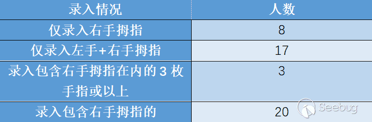 指紋、虹膜、人臉、靜脈這些生物特征,是人生下來就有的,并且具有不重復唯一性,可以用來很精準的對一個人進行識別判斷。在大家意識中,生物特征識別的安全性要高于傳統密碼的,同時生物特征又有驗證便捷的特點(相對于密碼輸入)。但是大家可能忽略了一點:這些生物特征數量少而且無法更改,一旦泄露就會存在安全風險,除非是剁手指、整容&毀容、扣眼珠,開個玩笑。而密碼,如果用了一個弱口令被猜出來了,你還可以換一個更復雜的。拿指紋舉例來說,一個人的指紋只有十枚,泄露了就再也無法挽回。更重要的一點,我們經常使用的手指,只有一或兩枚,我們做了一個20個人的小樣本統計,統計結果如下:(由于手機指紋識別有正面和背面兩種,分別對應拇指和食指,這里我們統一為拇指)