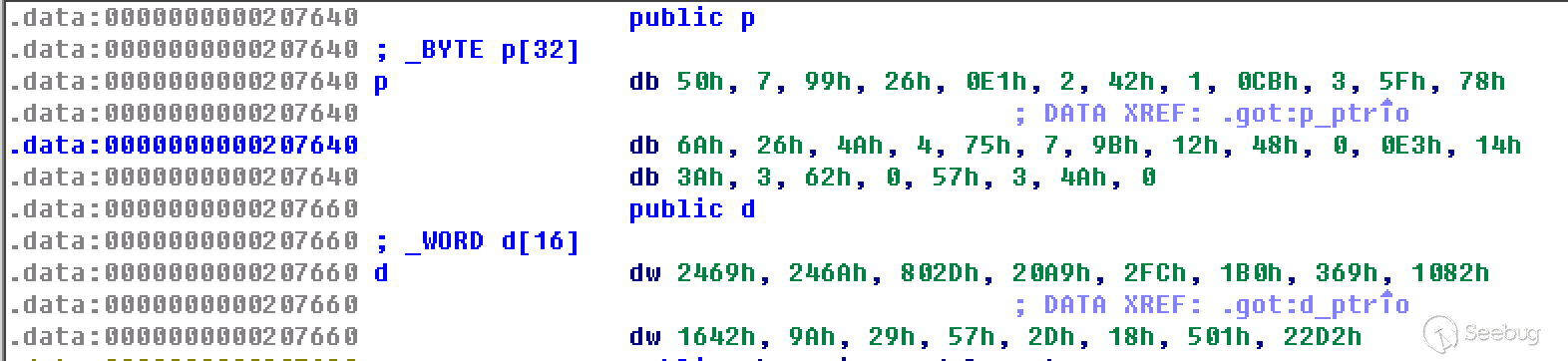 該部分代碼的關鍵部分應該是在 22-33行,這段代碼明顯是在做一個對稱加密(易得,證略~~2333終于可以說這句話了),雖然沒看到密鑰,但是我們發現這里面d和p這倆盒子是放在data段的: