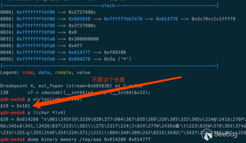 此時我已經把從pcompile_file到解壓流程前的代碼都調通了,編譯好之后在zdecode前下個斷點,文件長度存在v3中,此處直接print出來,為0x4f7,查看下v4的地址,然后直接從該地址dump binary memory 0x4f7個字節: