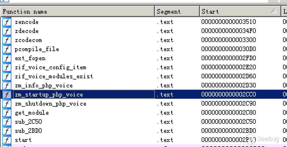 查了下php擴展開發的手冊,在載入擴展庫時,會首先調用get_module來獲得模塊接口,ida里看下發現返回了一個入口指針,但是我沒找到賦值在哪,然后我就把so里的所有function按照起始位置排序了下,然后就看到了get_module附近定義的幾個函數,特別是 zm_startup_php_voice 和 zm_shutdown_php_voice 這倆函數從函數名上看上去比較像是入口: