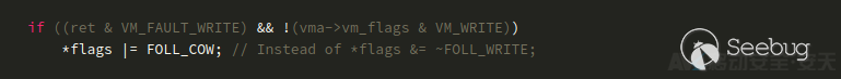 一般情況下在COW操作后移除FOLL_WRITE標志是沒有問題的,因為這時VMA指向的頁是剛經過寫時拷貝復制的新頁,我們是有寫權限的,后續不進行寫權限檢查并不會有問題。 但是,考慮這樣一種情況,如果在這個時候用戶通過madvise(MADV_DONTNEED)將剛剛申請的新頁丟棄掉,那這時本來在faultin_page后應該成功的follow_page_mask會再次失敗,又會進入faultin_page的邏輯,但是這個時候已經沒有FOLL_WRITE的權限檢查了,只會檢查可讀性。這時內核就會將只讀頁面直接映射到我們的進程空間里,這時VMA指向的頁不再是通過COW獲得的頁,而是文件的原始頁,這就獲得了任意寫文件的能力。