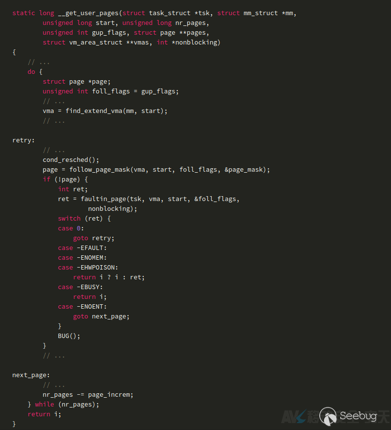 faultin_page函數申請內存管理的權限(同樣有PTE的spinlock保護)來處理目標地址中的錯誤信息。在成功調用faultin_page后,鎖會自動釋放,從而保證follow_page_mask能夠成功進行下一次嘗試,以下是涉及到的代碼。
