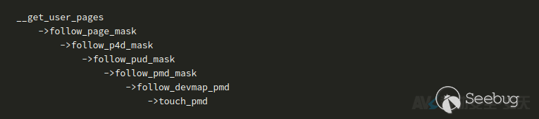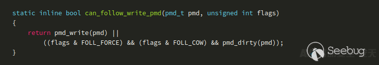 THP通過PMD(Pages Medium目錄,PTE文件下一級)的_PAGE_PSE設置來打開,PMD指向一個2MB的內存頁而非PTEs目錄。PMDs在每一次掃描到頁表時都會通過pmd_trans_huge函數進行檢查,所以我們可以通過觀察PMD指向pfn還是PTEs目錄來判斷是否可以聚合。在一些結構中,大PUDs(上一級目錄)同樣存在,這會導致產生1GB的頁。 仔細查看臟牛補丁中關于THP的部分,我們可以發現大PMDs中用了和can_follow_write_pte同樣的邏輯,其添加的對應函數can_follow_write_pmd: