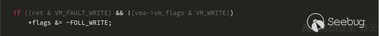 上面這個判斷語句想要表示的是,如果當前VMA中的標志顯示當前頁不可寫,但是用戶又執行了頁的寫操作,那么內核會執行COW操作,并且在處理中會有VM_FAULT_WRITE標志。換句話說在執行了COW操作后,上面的if判斷為真,這時就移除了FOLL_WRITE標志。