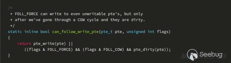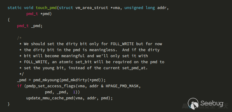 這個函數在每次get_user_pages調用follow_page_mask試圖訪問大頁面時被調用,很明顯這個注釋有問題,而現在dirty bit并非無意義的,尤其是在使用get_user_pages來讀取大頁時,這個頁會無需經過COW循環而標記為dirty,使得can_follow_write_pmd的邏輯發生錯誤。