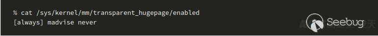 如果沒有源碼,在shell中可以查看/sys/kernel/mm/transparent_hugepage/enabled,如果輸出結果為[always]表示透明大頁被啟用、[never]表示透明大頁被禁用、[madvise]表示只在MADV_HUGEPAGE標志的VMA中啟用THP,例如: