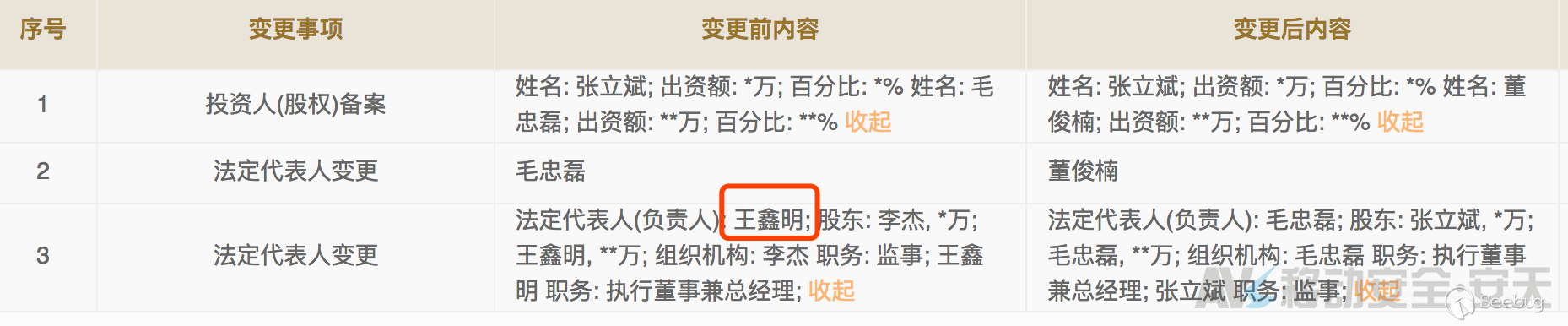 對“杭州奪寶電子商務有限公司”相關信息進行查詢,在其變更一欄中發現,王鑫明在2016年11月8日前曾經是該公司股東,經過變更后不在名單內。