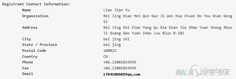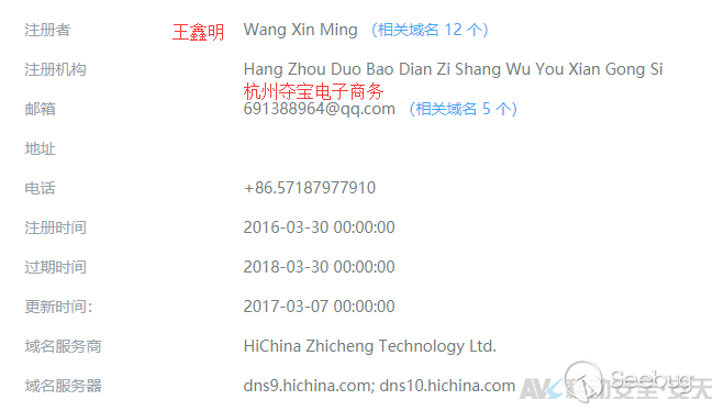 通過對喵掌折扣移動端App進行交互數據包抓取分析,發現其中包含的多個域名與其官網域名51mzzk.com的Whois信息相似,都使用了阿里云注冊商的隱私保護功能,無法得知其真實注冊人;但其中有一個域名未開啟隱私保護功能,如下圖所示,其顯示注冊人確實為王鑫明,而公司為“杭州奪寶電子商務有限公司”,郵箱地址是691388964@qq.com,其注冊時間是2016年3月30日。