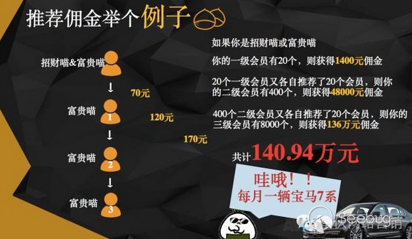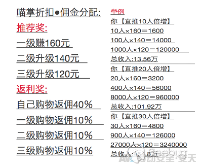 第二等級的會員“招財喵”需要繳費100元升級,升級后可以進行推廣發展下線,從中獲取傭金,同時也可以從下線使用優惠券的收益中獲取傭金;但這一級別的會員有提現額度限制,僅300元。