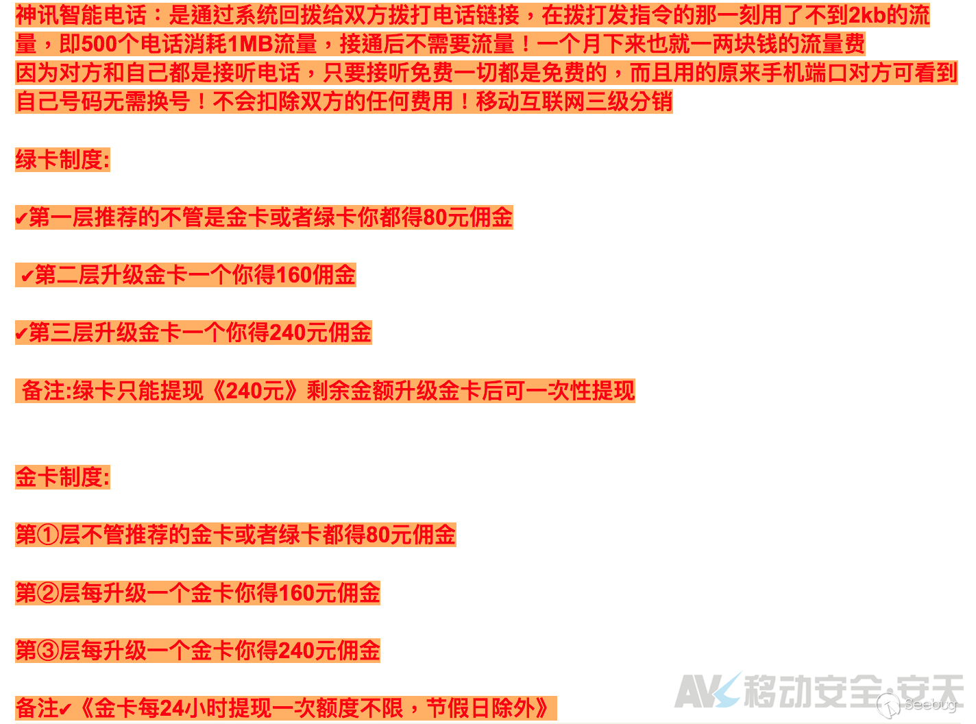 電信業務作為各類詐騙事件大多涉及的一項元素,在傳銷詐騙類犯罪活動的語境內,往往作為一項“幌子”而存在,披著電信分銷或“企業電話”等運營商業務的名頭,行傳銷詐騙之實;雖然有時傳銷詐騙組織也會實際為受害者提供一定的電信業務(免費撥打、免費短信等,如章節3.6.1中“蕓生仙子”案例與3.1.1.3中的“優暢神訊”網絡電話),但往往不具備穩定性或可用性,且本身電信類業務根據商務部,工商總局2016年第7號文《關于直銷產品范圍的公告》,并不包含在規定合法的6類直銷產品中。