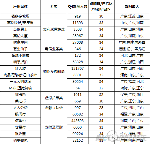以購物及返利為名目的相關應用影響人數逐月走高,應與接近年底各傳銷組織下線業務需求增加有關;