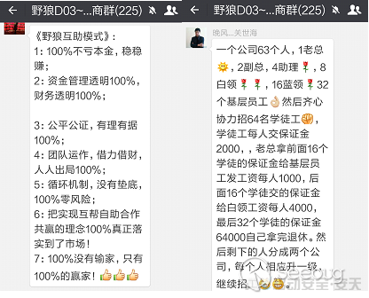 此種傳播方式往往自成一個閉環,如群組可能偽裝為“網賺”、“創客”、“兼職”、“報單”等合法的邀請制群組,受害者往往只能通過群組已有成員邀請加入,或是通過支付一定“入群費”加入,繼而通過群內推廣進入其平臺(App或網站等),亦有利用群組本身進行直接傳銷的行為(多見于微信群,見圖2-2)。受害者在單一群組中可能接觸到多個與傳銷詐騙相關的平臺,容易使單一用戶遭受多次詐騙損失。