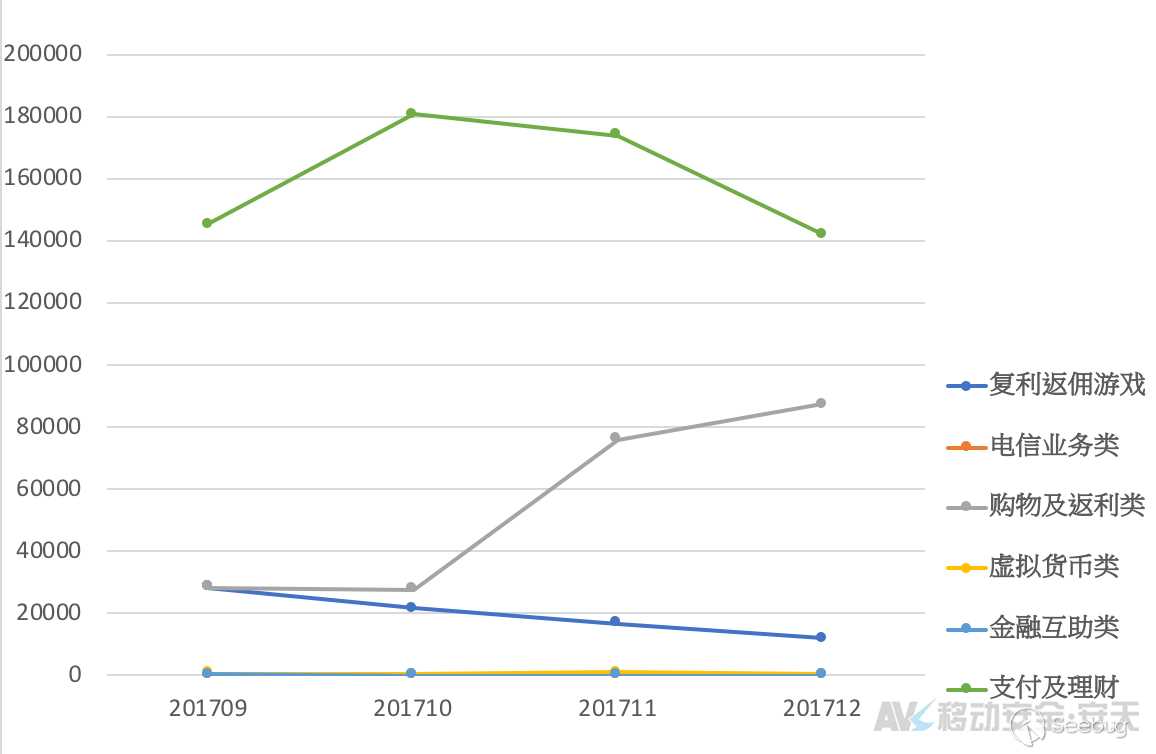 上圖是依據2017年9月至12月(12月數據截至中旬)相關監測數據進行的篩選統計結果。不難看出,作為傳銷詐騙行為承載平臺的移動端應用中,影響面占比較大的的主要是支付理財類、購物及返利類以及新興的復利返傭游戲應用,同時電信業務類、虛擬貨幣類、金融互助類也具備一定活躍度,但影響相對較小。