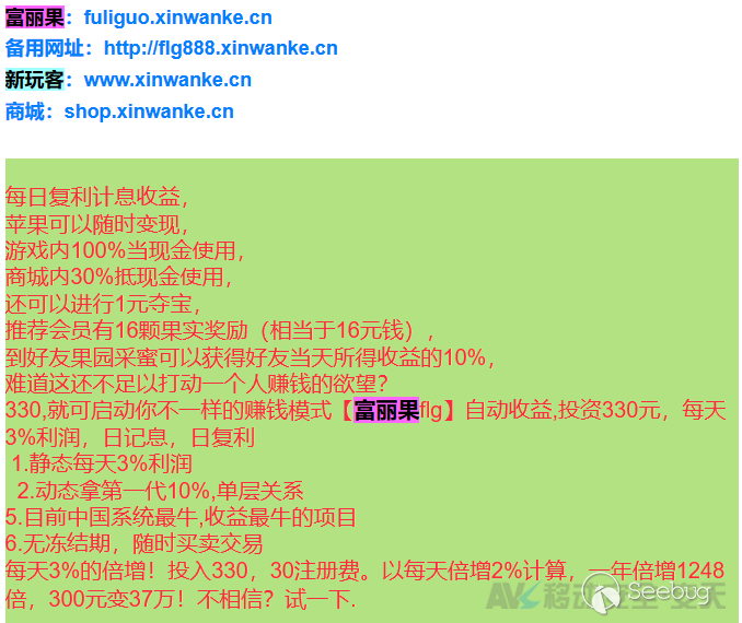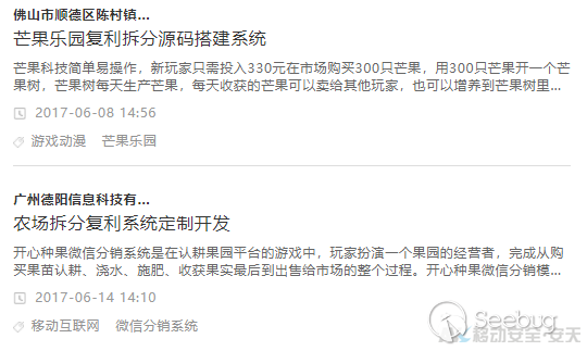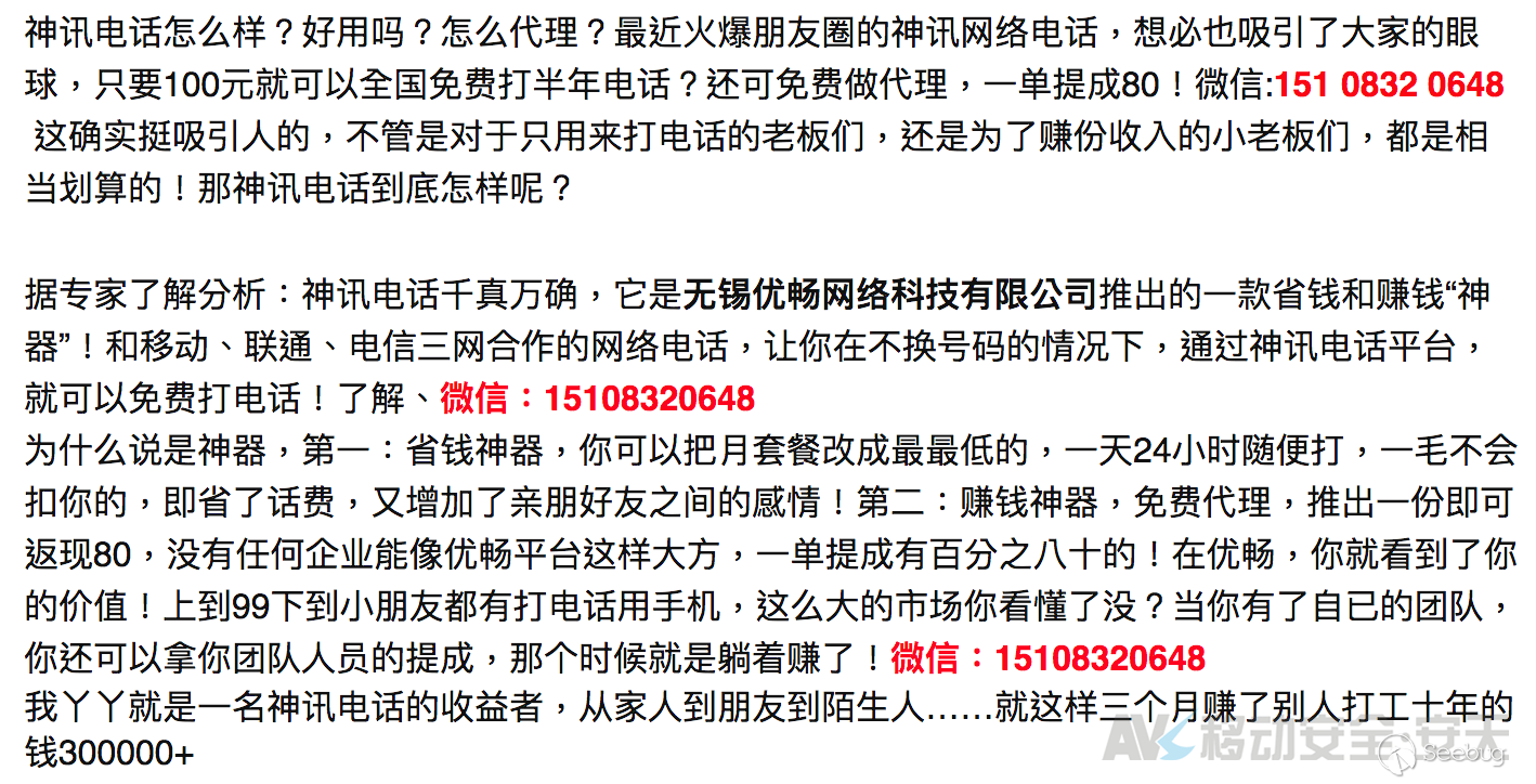 此種傳播方式往往本著“廣撒網”的思路,通過傳統的消息發布配合其具備吸引力的文案,進行其平臺(App或網站等)推廣;而推廣平臺也視乎其聲稱業務不同,可能以各類具備社交或聊天功能的平臺作為推廣載體。
