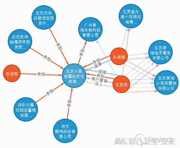 通過瀏覽其官網http://www.xiaoheiqun.com ,我們只留意到該團體聲稱自己為“SOIREE奢瑞小黑裙”,而并未發現任何正式的公司及注冊實體名稱。通過對法人王思明名下的公司進行挖掘,我們能夠得到其與“奢瑞小黑裙”相關公司的關系,如下圖: