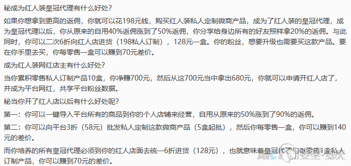 其“會員”體系及“代理”層級,實質上就是傳統傳銷詐騙行為中的上下線架構,上線依靠發展下線的傭金獲利,甚至過程中“坑熟”的行為一如傳統傳銷般廣泛存在;同時,其中存在當前各類微商、直銷渠道中較為慣用的“價格黑箱”手段,如下圖所示所謂“定制微商產品”、“私人定制產品”都屬于典型的價格黑箱,為“紅人裝”運作公司攫取不法利益的手段之一。