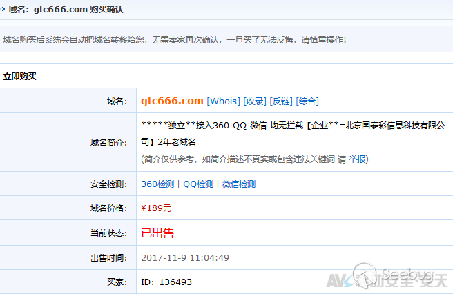 在互聯網公開情報中挖掘該域名相關信息,發現該域名是在國內某域名交易網站成功交易的“免備案域名”,即已有備案信息的合法域名過期注銷后,由域名代理搶注并以“免備案即可使用”名頭出售的。該域名的原備案公司即gtc666.com后臺標題中偽裝的“北京國泰彩信息科技有限公司”,應與該傳銷組織無關。