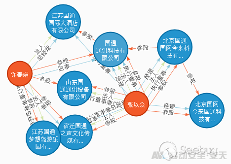 由圖及其他外部信息進一步挖掘分析可知,張以眾除了具備“南京國通通訊科技有限公司”法人身份之外,還在以下公司擔任高管職位(包括但不限于):