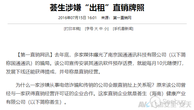 其中,可能考慮到“國通通訊”其企業實體并不具備直銷資質,在開展傳銷詐騙活動的過程中,其也與海南一家名為“蕓生(海南)健康產業有限公司”的企業建立了租借直銷牌照的合作關系,同樣遭到媒體屢次曝光。