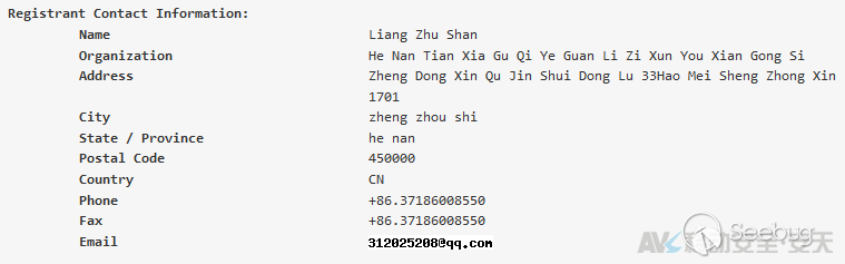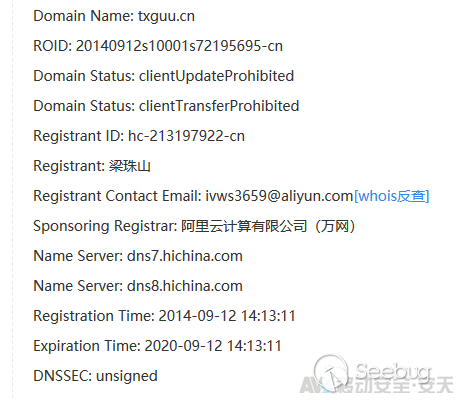 同時,對“河南天下谷企業管理咨詢有限公司”官方網站域名txgpay.com進行Whois域名信息查詢,發現其歸屬人也為Liang Zhu Shan(梁珠山),如下圖: