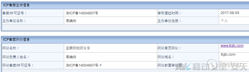 通過“高通幣”首頁下方的ICP備案號“豫ICP備14004807號”進行相關信息查詢,可發現8gtc.com的備案網站名稱與8gtc.com首頁標題相同,而8gtc.com也為“高通幣”傳銷詐騙團伙實際控制,備案人姓名為易曉梅(河南省),應為經過權威部門校驗的真實信息,應為“高通幣”傳銷詐騙團伙的重要成員之一。