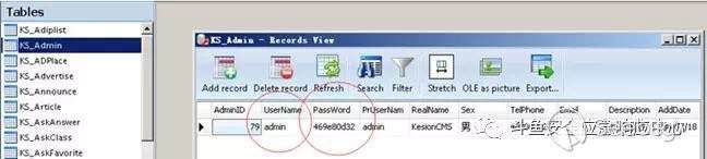 由于編寫payload文件流程都一樣,這里拿asp來舉例。通常還會有jsp,php,java等不同腳本語言寫的cms。比如漏洞:KesionCMS最新版本可下載數據庫直接破密碼,kesioncms是asp寫的cms。漏洞原因可直接訪問/KS_Data/KesionCMS9.mdb路徑,下載數據庫文件到本地。把文件用Easy Access打開,表結構及KS_Admin中數據如圖 3-3-2-1 所示: