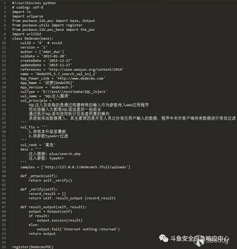 最上面是引入一些類庫,中部是一個 PoC 的類,繼承自PoCBase 類,類中有兩個函數,_verify和_attack ,這兩個分別是 verify 和 attack模式的入口函數,然后還有一個用戶自己定義的函數parse_result , 用于統一輸出。類里的變量是對漏洞描述的詳細介紹,由上而下為:漏洞id,工具版本,漏洞編寫者,漏洞發布時間,漏洞寫入工具時間,漏洞文件最近更新時間,漏洞來源,漏洞名稱,CMS鏈接,CMS名稱,CMS版本,漏洞類型所屬文件,漏洞類型,漏洞原理,漏洞修復,漏洞危害級別,漏洞詳情描述。有了這些變量在漏洞掃描結束這些信息會選擇性的寫入漏洞結果的doc文件。