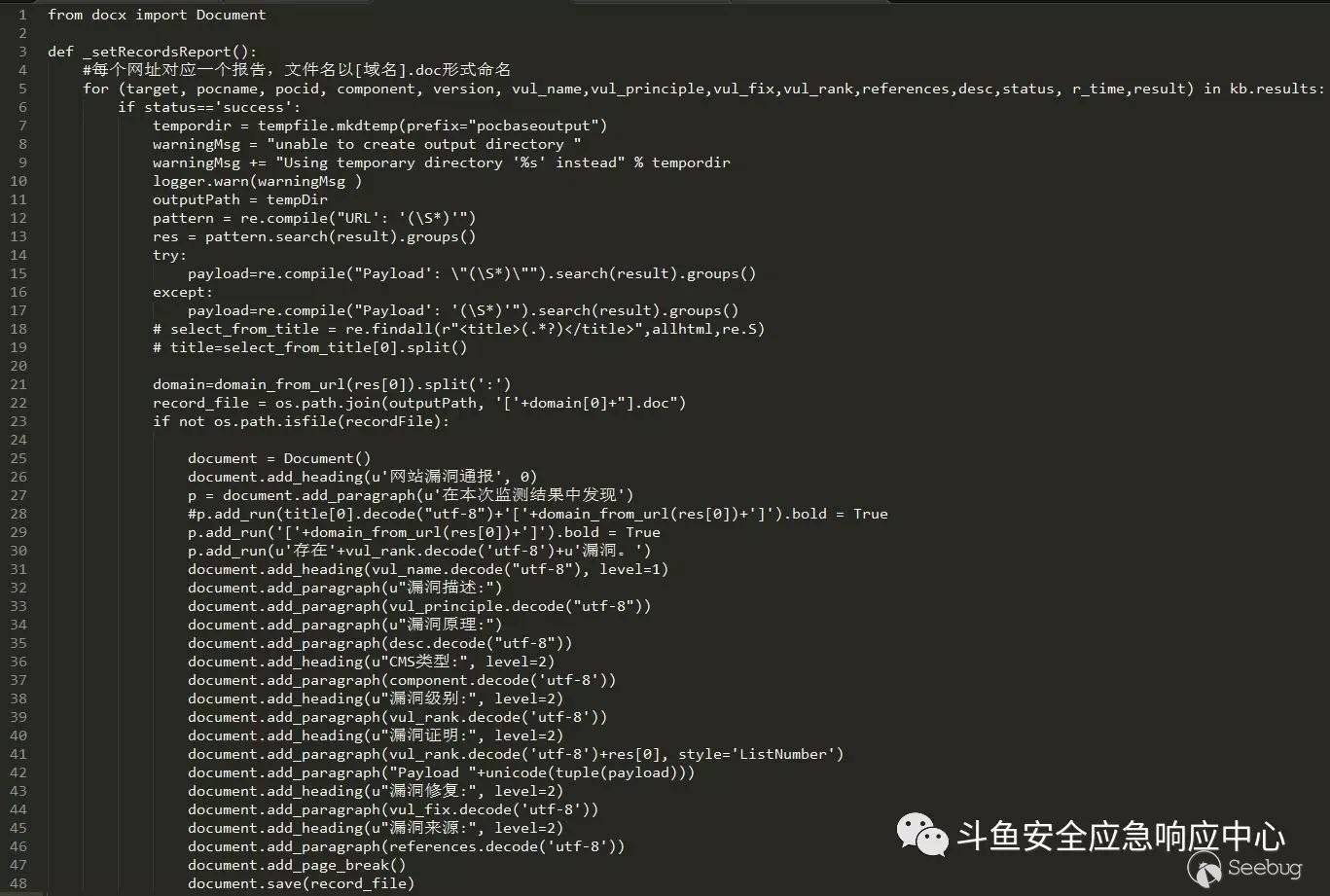 (2)漏洞結果生成。這邊改動為,生成隨機文件夾里面每個url每個payload文件生成一個doc文件,文件名格式[網站域名].doc,文件內容使用python的庫docx來生成doc格式的文件。