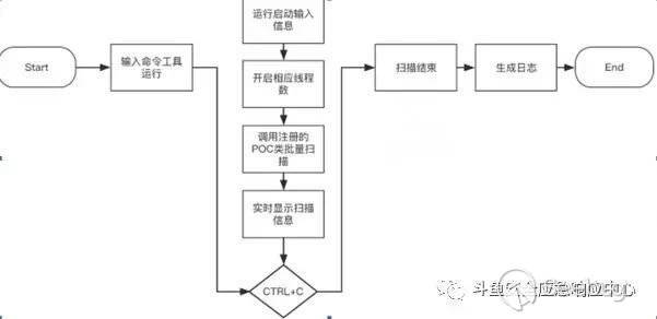 CMS漏洞掃描工具是通過輸入不同的命令來控制不同的掃描方式。輸入命令將程序運行,然后輸出一些界面信息比如什么工具、什么版本、當前運行時間之類表示程序已經啟動,接著是,開啟線程調用注冊過的POC類,批量掃描,掃描過程界面上會實時顯示掃描的網站信息,最后掃描結束,生成報告日志。系統運行流程如圖 3-3 所示: