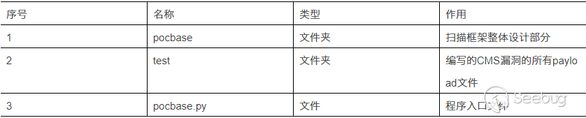 工具需要最基本核心的是基本框架的實現,只需要把重心放在基本框架上對于多線程的寫入提高了系統運行效率,其他就是源源不斷的整合CMS漏洞,寫出的payload只需要按照一定格式寫進入就可以使整個工具跑起來,不需要把精力放在如何跑起來這種重復的工作上。程序運行起來的過程是:啟動入口文件pocbase.py,調用pocbase/pocbase_cli.py里main(),接著調用pcsInit()將程序啟動起來。目錄結構如表 3-1 所示: