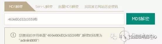 由圖知,用戶名為admin 密碼為469e80d32c0559f8。憑經驗看出密碼是經過MD5加密之后存到數據庫中,我們在網站http://pmd5.com/# 上MD5解密之后得到密碼為admin888,如圖 3-3-2-2 所示: