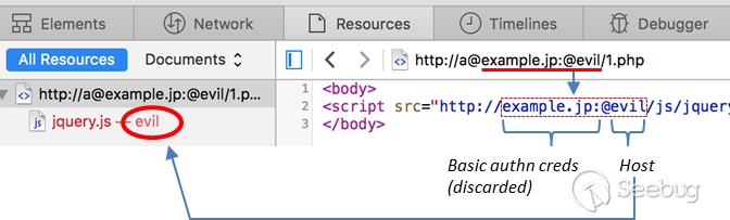 這種情況下,Safari并不會加載此畸形的URL(URL不合法),而攻擊者是想要在Safari加載他自己服務器上面的JS。