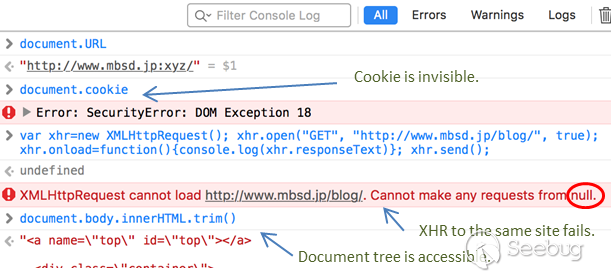 加載的JS是在加載損壞內容的情況下進行的,因此不能通過XHR的方式獲取同站點的cookie。但是依然可以對自身的document內容進行操作,這意味著攻擊者可以修改頁面內容。使用Cookie驗證的頁面也是可以進行攻擊利用的,因為請求中帶有cookie。
