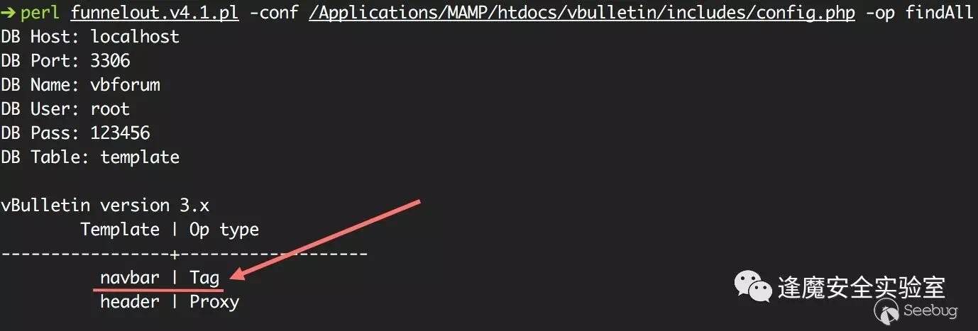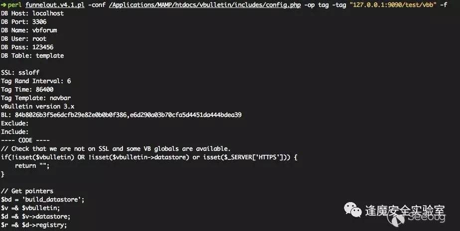 數據庫連接分為兩種,一種是直接通過定義數據庫連接的相關參數進行數據庫訪問,包括數據庫的ip地址、端口、vbulletin庫名、用戶名、密碼等,在mysql可遠程訪問時可以通過這種方法連接至數據庫進行遠程控制;另一種方式就是腳本直接讀取vBulletin的數據庫配置文件config.php進行解析,獲取host、port、dbuser、dbpass、dbname等再進行數據庫連接,當然可能是在應用服務器上執行,也可能是將配置文件拖回來后本地解析再遠程訪問等情況。