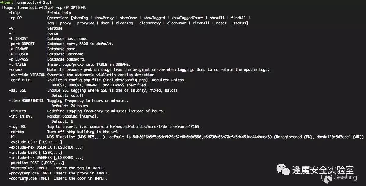 這里我們挑選v4.1.0.1版本進行分析。腳本運行環境需要perl支持,直接運行該腳本會展示出該工具的使用方法,其中包括數據庫的連接方法、后門操作及其他可自定義參數等。