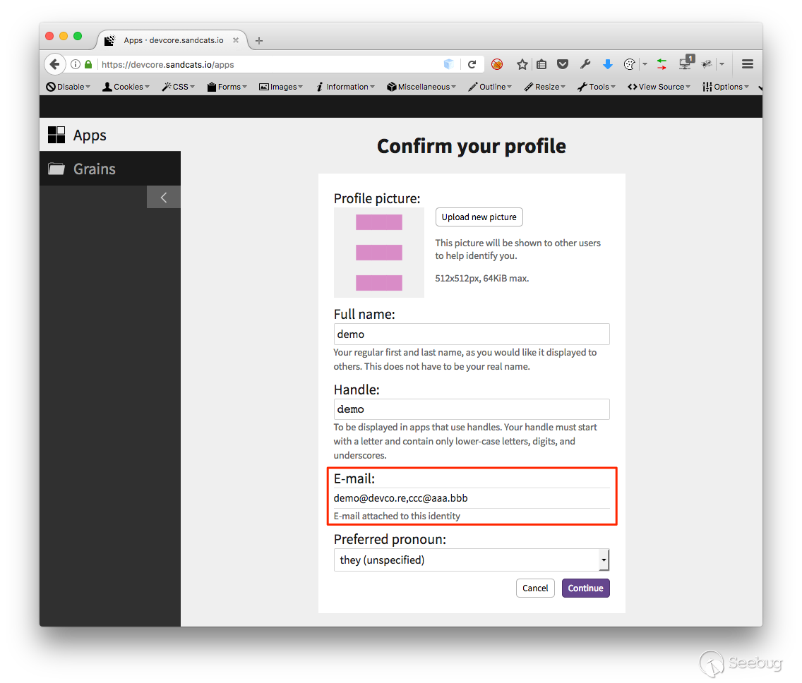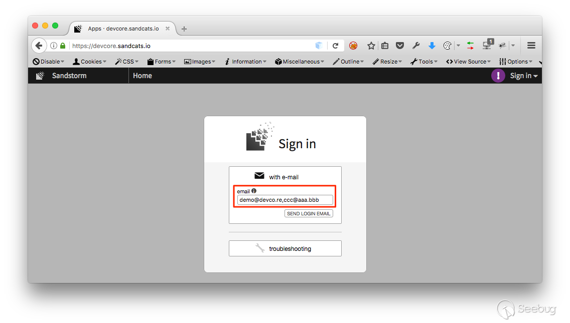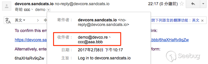 這項攻擊得以成功還有另外一個關鍵點,發生在 Sandstorm 登入的一個特色上。使用 Sandstorm 服務不需要設定密碼,使用者每次欲登入時填入 email,系統便會發送一組每次皆不同的隨機密碼作為登入使用。上述的例子之所以能夠成功,就是因為系統將 demo@devco.re,ccc@aaa.bbb 視為一個 aaa.bbb 網域的使用者,而隨機密碼會發送到 demo@devco.re 以及 ccc@aaa.bbb 兩個不同信箱中,只要可以收到密碼就可以登入使用服務。
