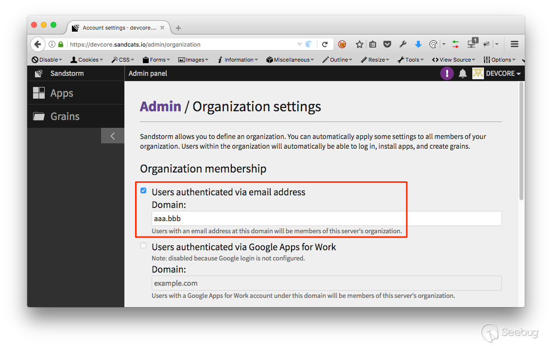 1.在 Sandstorm 限定只有用 aaa.bbb 網域才可以登入。