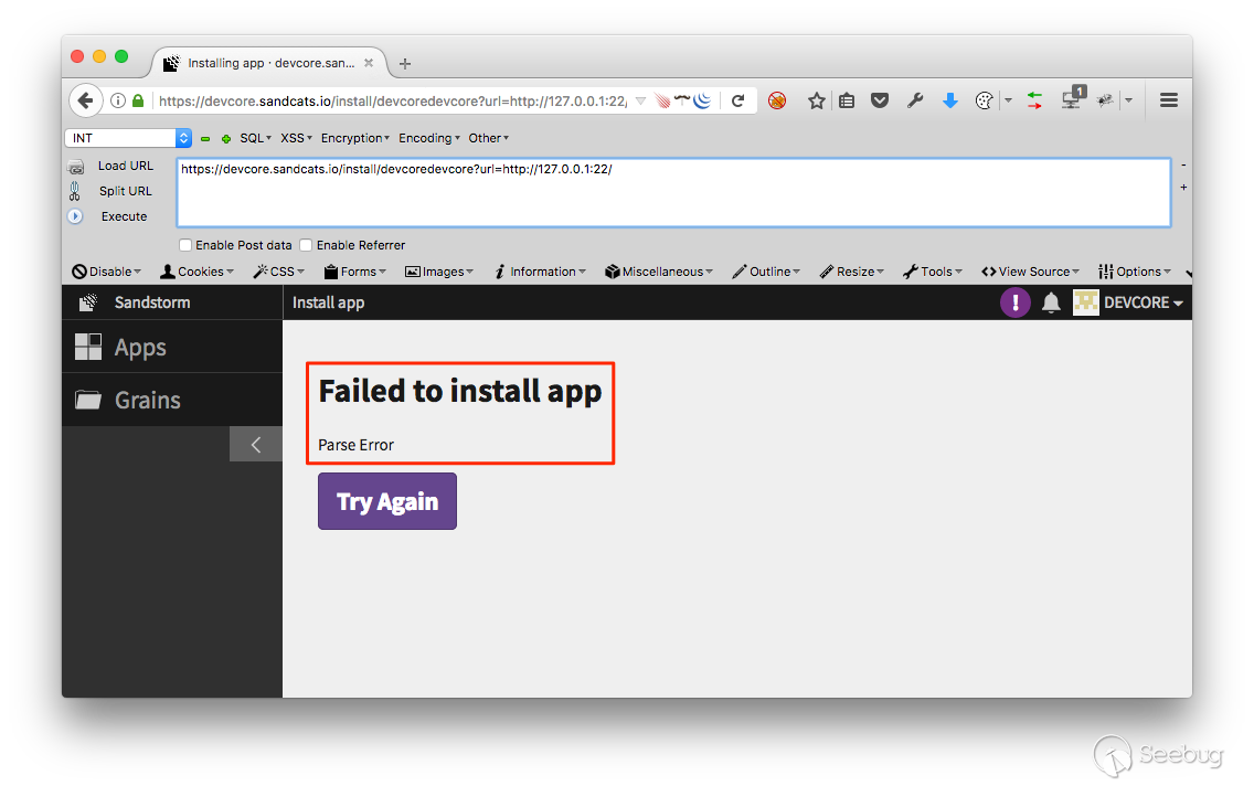 這是經典的 SSRF(Server-Side Request Forgery)問題,在 Sandstorm 安裝 App 流程沒有限制安裝來源,攻擊者提供一個安裝 URL 就能讓伺服器存取該位置。該問題發生在 https://[target]/install/xxxChangeItEveryTimexxx?url=http://127.0.0.1:22/,這個範例連結得以確認伺服器的 22 port 是否開啟。
